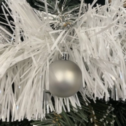 Culoarea albă contrastează frumos cu verdele și, alături de luminițe, creează un luciu fin, festiv – ideal pentru decoruri moderne sau tradiționale.