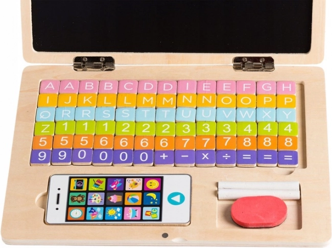 - laptop educativ din lemn 2‑în‑1 (tablă magnetică + tablă pentru cretă)