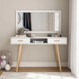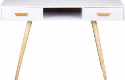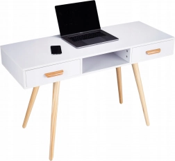 Blatul laminat este rezistent la zgârieturi și decolorare, aspect valoros în utilizarea de zi cu zi. Picioarele masive din pin asigură fermitate și stabilitate, fără mișcări nedorite. Două sertare spațioase și nișa centrală deschisă găzduiesc cosmetice, rechizite și accesorii mici.