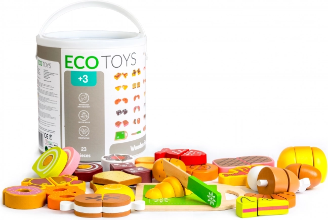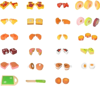 Această set impresionant de alimente colorate, pe care le cunoaștem din bucătărie, este un cadou minunat pentru fiecare copil. Copilul dumneavoastră va învăța să recunoască alimentele preferate și, datorită posibilității de a tăia și asambla, își va exersa abilitățile manuale.