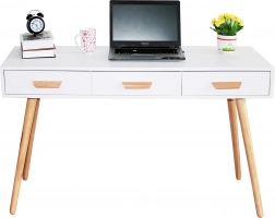 Bucurați-vă de designul modern al acestui birou, care combină un blat alb cu elemente din lemn de pin. Forma interesantă și execuția atentă asigură un aspect atractiv în orice interior. Acest birou poate servi ca masuță de toaletă în dormitor, birou bine proiectat în birou sau consolă în camera de zi.