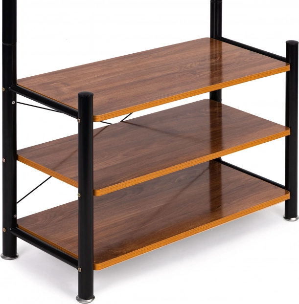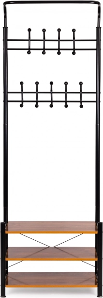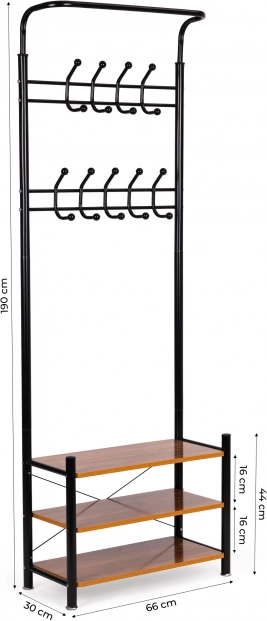 Partea superioară are două rânduri cu 18 cârlige, ceea ce face cuierul ideal pentru dressinguri, birouri sau săli de așteptare. Partea inferioară conține trei rafturi funcționale pentru articole mai mici, genți sau pantofi. Stabilitatea este garantată prin baza metalică cu patru picioare.
