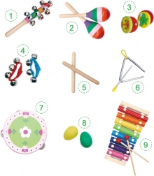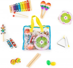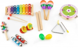 Setul include instrumente de percuție îndrăgite – de la tamburină și trianglu la maracas și cinele – prin care copilul își dezvoltă coordonarea mână–ochi, concentrarea și creativitatea. Prelucrarea sigură fără muchii ascuțite și materialele rezistente asigură o durată de viață îndelungată.