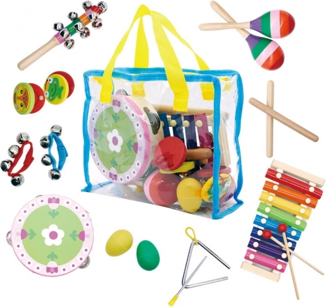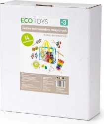 Set colorat de instrumente muzicale pentru copii de la 3 ani, marca ECOTOYS. Conține în total 14 piese și o geantă transparentă practică pentru transport ușor. Susține dezvoltarea motricității, percepției auditive și simțului ritmic. Fabricat din lemn și metal de calitate, fără elemente periculoase și cu certificare CE/EN71.