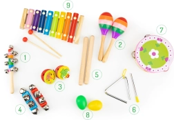 - jănjine (agogo/hand bells), maracas (2 buc), castaniete (2 buc), jănjine pe bretele (2 buc), bețe ritmice (2 buc), trianglu, tamburină, zornăitori (2 buc), cinele