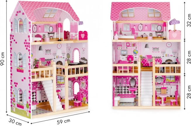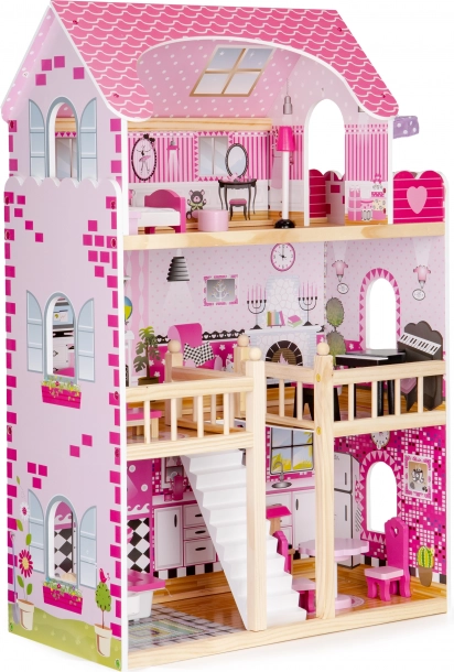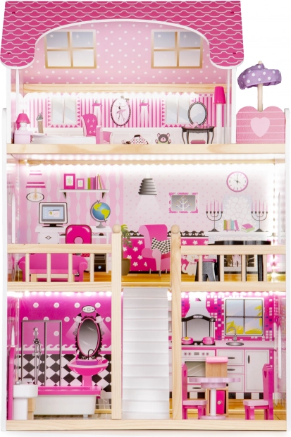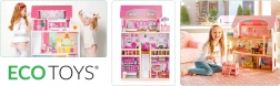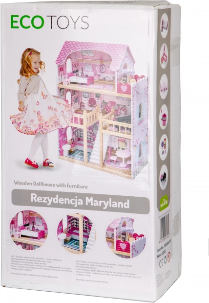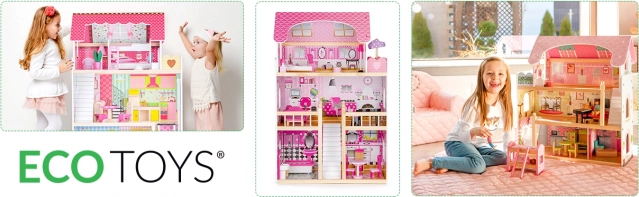 Căsuța pentru păpuși ECOTOYS este proiectată pentru joacă creativă și dezvoltarea imaginației copiilor. Este compusă din trei niveluri independente, cu un total de cinci încăperi, care imită perfect o casă reală. Fiecare încăpere este echipată cu mobilier și decorațiuni ce pot fi mutate cu ușurință în funcție de preferințele copilului.