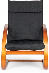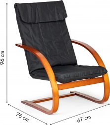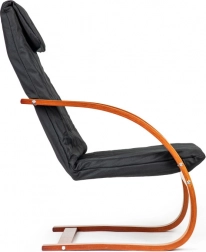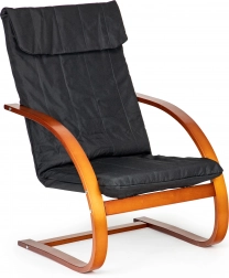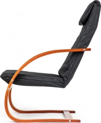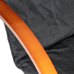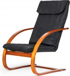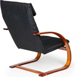 Bucurați-vă de momente de odihnă într-un fotoliu care combină designul modern cu ergonomia. Mecanismul de legănare calmează și oferă alinare spatelui, iar căptușeala moale cu umplutură din spumă asigură confort la citit, relaxare sau vizionarea televizorului. Contrastul dintre textilul negru și lemnul de nuc evidențiază caracterul oricărui interior.