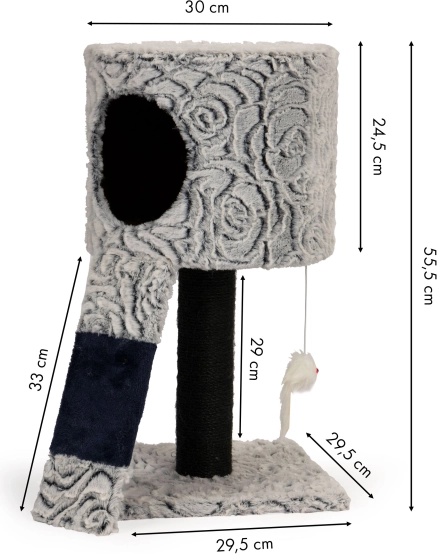 Fiecare platformă este acoperită cu plus moale, oferind un loc grozav pentru odihnă și confort. Sunt incluse și trei pompoane suspendate care încurajează joaca și asigură distracția animalului tău de companie. Datorită construcției stabile, ansamblul este ferm și sigur, esențial pentru stabilitate în timpul jocului.