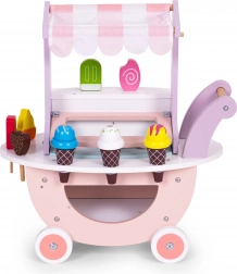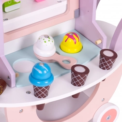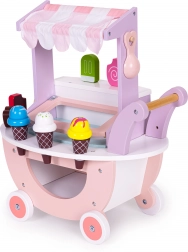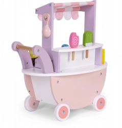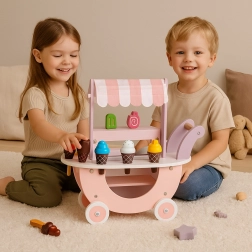 Oferiți-le copiilor ore de distracție creativă cu standul de înghețată ECOTOYS. Datorită căruțului mobil cu copertină și accesoriilor bogate, copiii intră ușor în rolul de vânzător și client. Execuția din lemn, marginile rotunjite și culorile blânde susțin un joc liniștit și sigur.