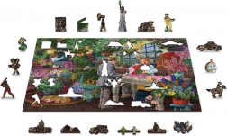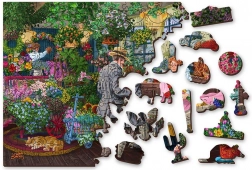 Un puzzle din lemn stilat, cu tema unei florării pline de viață, îi va încânta pe iubitorii ilustrațiilor detaliate și ai puzzle-urilor mai solicitante. Datorită execuției reversibile te bucuri de două puzzle-uri într-unul – fața cu o scenă colorată plină de flori și verso-ul cu model pentru asamblare după forme. Decupajele unice în formă de animale, personaje și obiecte funcționează ca mici figurine și adaugă o nouă dimensiune experienței.