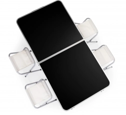 Setul se pliază într-un geamantan practic, unde toate scaunele și masa sunt depozitate în siguranță. Astfel, este ușor de transportat chiar și în spații limitate.