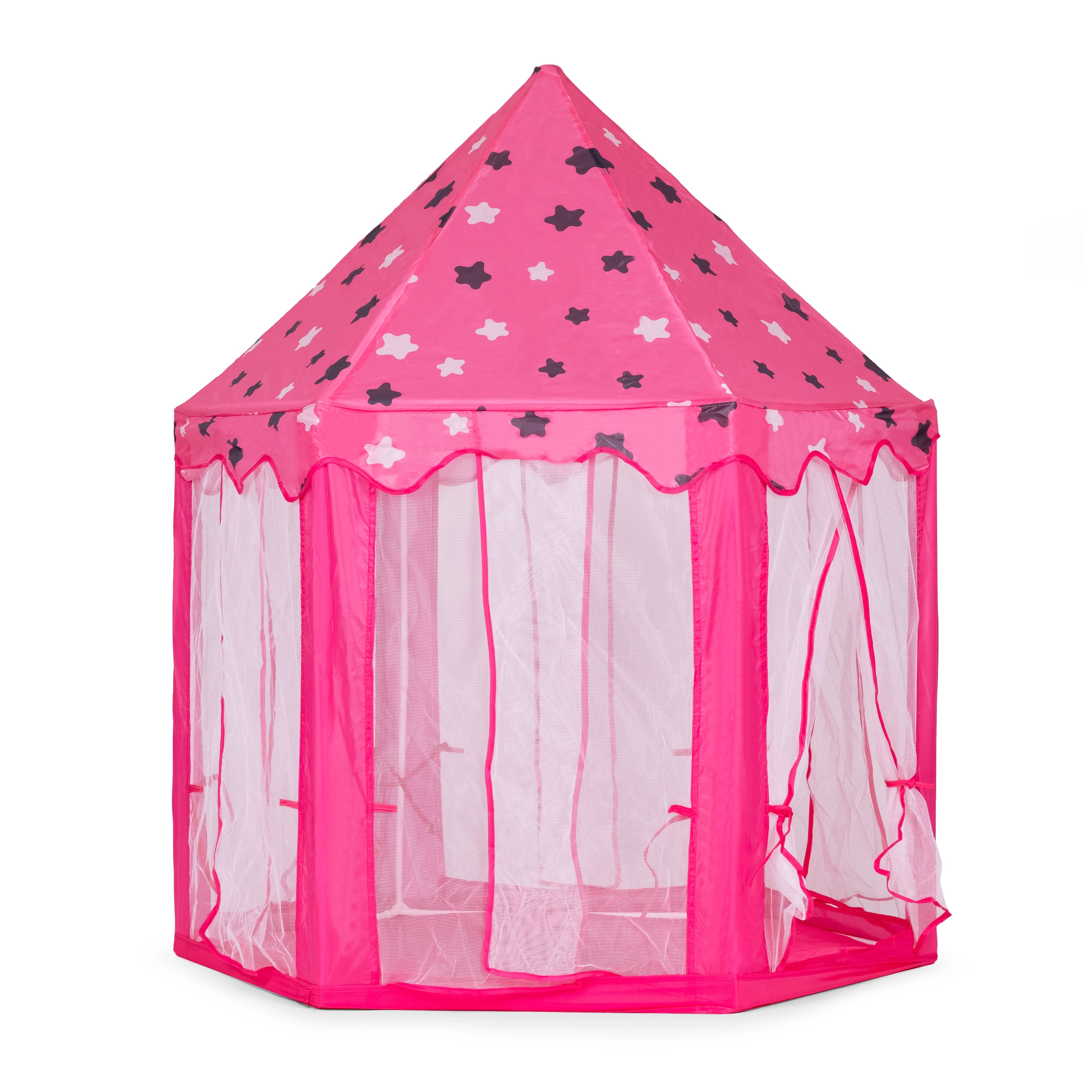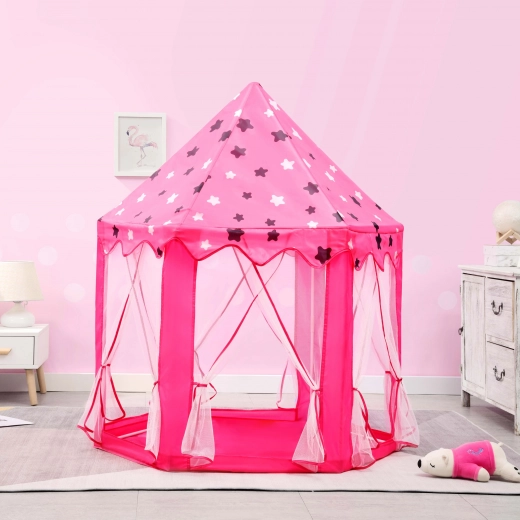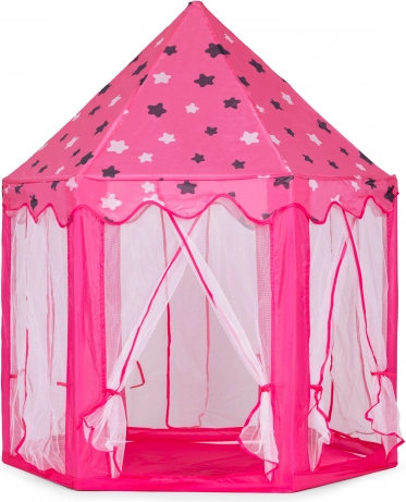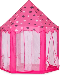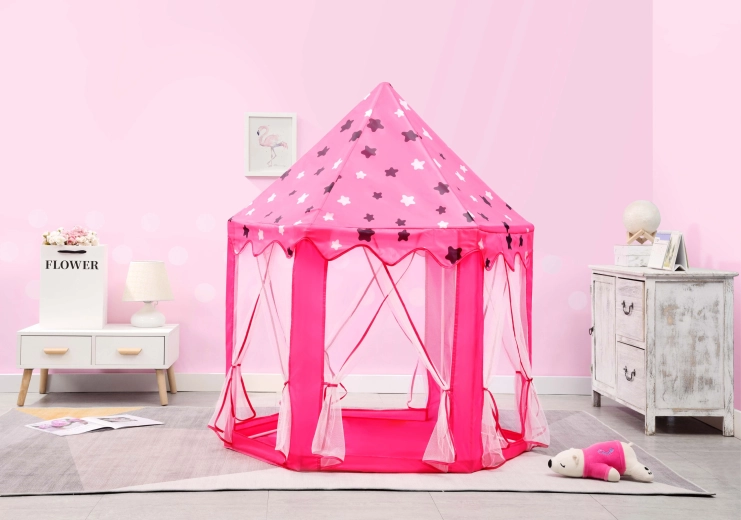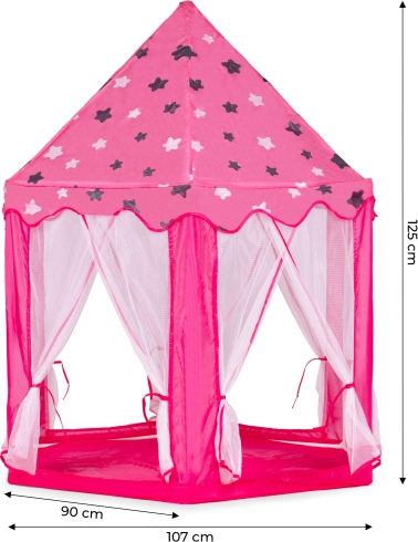 Transformați camera copilului într-un regat de basm. Acest cort în formă de castel de prințesă oferă un colț confortabil pentru joacă, citit și relaxare. Datorită cadrului pliabil ușor și covorașului textil, îl instalați cu ușurință atât în casă, cât și afară. Panourile transparente din plasă asigură fluxul de aer și vizibilitatea activităților din interior.