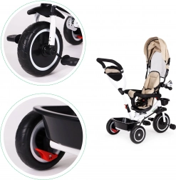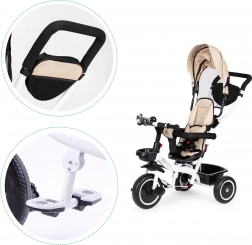 Mânerul pentru conducerea tricicletei este amplasat practic în partea din spate și, după cum e necesar, poate fi eliminat. După demontarea acestuia, copiii pot conduce autonom folosind volanul. Suporturile pentru picioare pliabile sunt perfecte pentru copiii care încă nu ajung la pedale, permițând odihna confortabilă a picioarelor în timpul plimbărilor sub supravegherea părinților.