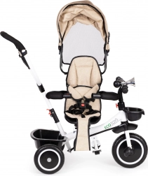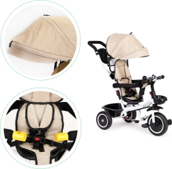 Tricicleta este echipată cu un suport moale, centuri de siguranță și o copertină rabatabilă care protejează de vreme nefavorabilă.