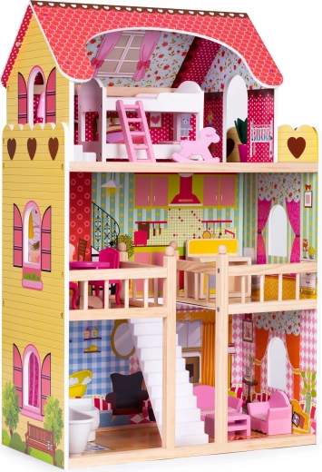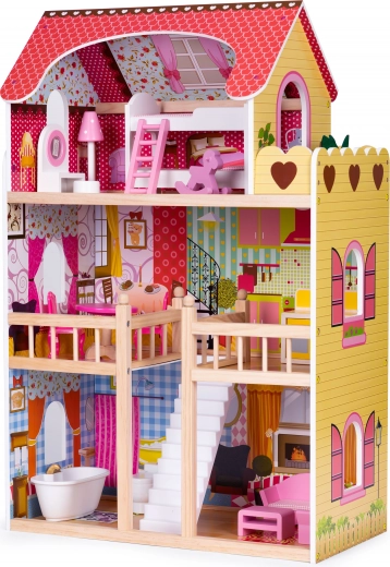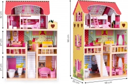 Întreaga căsuță este fabricată din lemn de calitate , ceea ce înseamnă că jucăria va servi mulți ani. La parter se află baia și livingul cu o canapea pentru păpușă. Primele două niveluri sunt conectate prin scări albe din lemn. Etajul al doilea a fost echipat cu bucătărie și sufragerie și cu balustradă din lemn care previne căderea păpușii. La etajul superior găsești dormitorul păpușii, cu acces la terasă .
