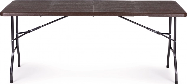 Masă pliabilă de catering practică, 180 × 74 cm, cu decor de lemn maro, ideală pentru petreceri, evenimente și grădină. Oferă construcție stabilă din oțel, blat din HDPE durabil, cu grosime de 4 cm și sistem rapid de pliere într-o valiză cu mâner. Datorită capetelor antiderapante și capacității de încărcare de până la 100 kg este potrivită pentru interior și exterior și este 100% impermeabilă.