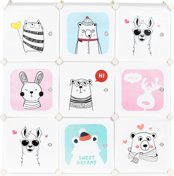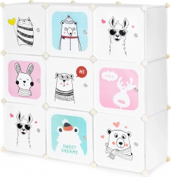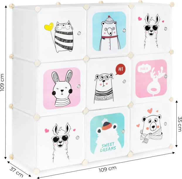 Acest dulap modular pentru copii aduce ordine și o notă jucăușă camerei. Cele nouă cuburi separate, cu uși ușor de deschis, găzduiesc jucării, cărți și haine, în timp ce ilustrațiile colorate cu animale fac spațiul mai primitor și stimulează imaginația copiilor. Structura ușoară este sigură pentru cei mici și le permite să mențină singuri ordinea.