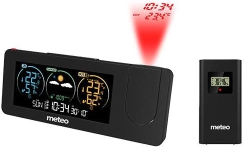 Stația meteorologică digitală METEO oferă o soluție completă pentru măsurarea temperaturii și umidității, atât în interior, cât și în exterior. Este echipată cu un proiector care afișează informații cheie precum ora și temperatura pe o suprafață aleasă din cameră.