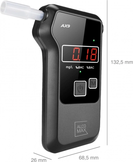 AlcoMax AX9 este un tester de alcool electrochimic de încredere, care oferă o precizie ridicată de măsurare până la 0,001% BAC. Echipat cu memorie pentru ultimele 20 de măsurători și timp de pornire rapidă de 5 secunde.
