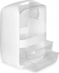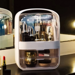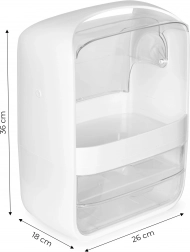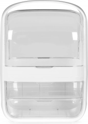 Această cutie pentru cosmetice, în elegantul alb, vă ajută să aveți îngrijirea zilnică mereu la îndemână. Compartimentul superior cu capac transparent rabatabil găzduiește comod flacoane de creme, seruri, parfumuri și chiar recipiente mai înalte, în timp ce cele două sertare spațioase păstrează ordonate și protejate de praf mărunțișurile precum paletele, rujurile sau pensulele.