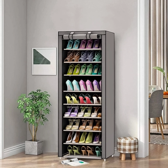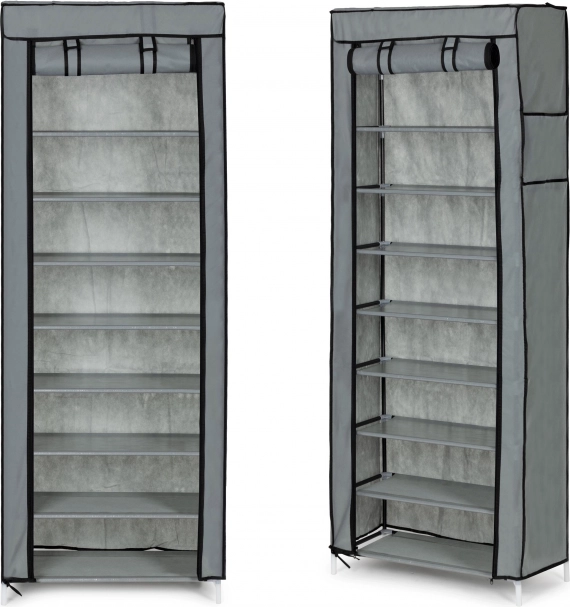 Cadrul stabil din țevi metalice cu conectori din plastic asigură robustețea întregii construcții. Rafturile din textil rezistent sunt întinse între țevi, ceea ce adaugă rigiditate și permite o depozitare comodă și ordonată. Datorită distanței dintre rafturi de aprox. 15 cm vei organiza cu ușurință hainele și încălțămintea.