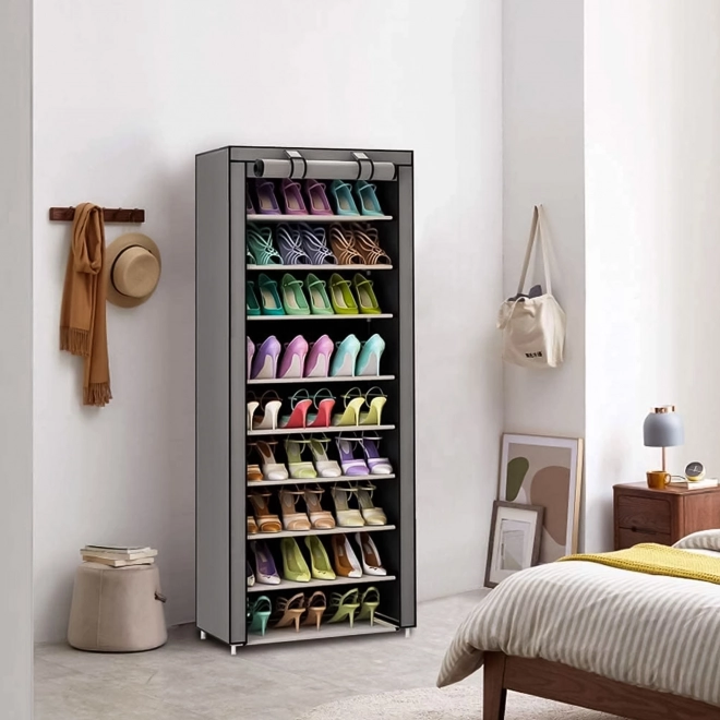 Dulapul textil practic cu mai multe niveluri de depozitare te ajută să menții ordinea în haine, accesorii și încălțăminte. Datorită dimensiunilor compacte 58 × 28 × 161 cm încape chiar și în spații mici. Oferă până la 9 rafturi, o construcție metalică solidă cu conectori din plastic și husă rulabilă cu două fermoare împotriva prafului. Nu lipsește buzunar lateral pentru mărunțișuri și montaj ușor, fără scule.