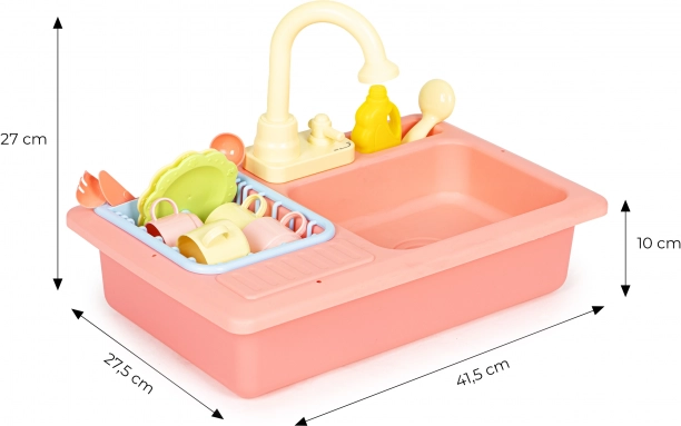 Chiuveta imită fidel o chiuvetă reală, cu un uscător retractabil și loc pentru soluții de spălat vase și perii. Include: 4 cănite, 2 farfurii, tacâmuri, o perie și o sticlă de jucărie pentru soluția de spălat vase.