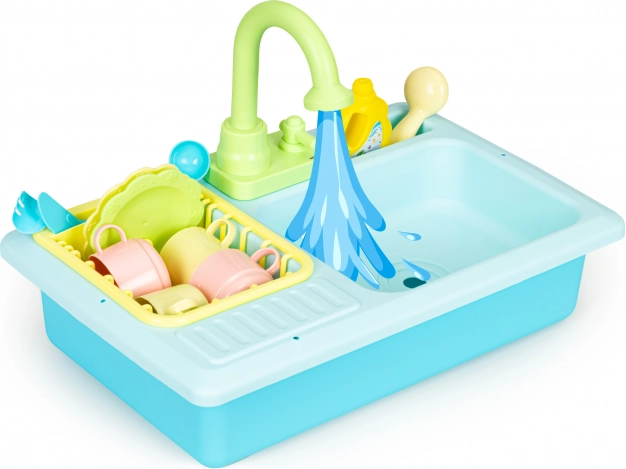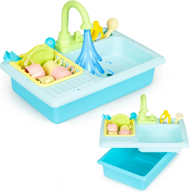 Chiuveta include un **dublu fund** pentru siguranța apei și simulează funcționarea unei chiuvete reale printr-o **pompă alimentată de baterii**.
