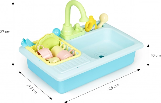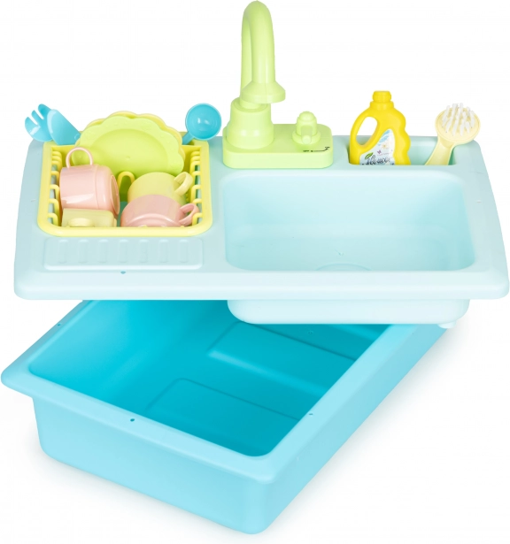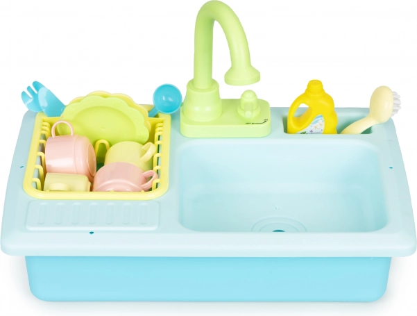 Pe lângă chiuvetă, setul conține: **4 cești, 2 farfurii, tacâmuri, o perie și o sticlă de detergent de jucărie**.