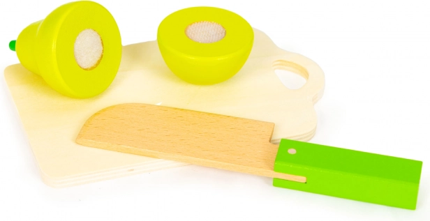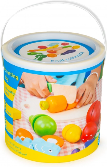 Acest set de tăiat din lemn oferă copiilor o experiență realistă de joacă în bucătărie. Bucățile de fructe și legume sunt împărțite în jumătăți și unite cu scai, astfel încât la tăiere oferă o ușoară rezistență și un sunet autentic. Prelucrarea atentă din lemn rezistent și culorile vii susțin percepția senzorială și jocul creativ.