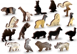 Puzzle-ul conține piese cu forme unice reprezentând animale și obiecte, care pot fi folosite și ca figurine independente.