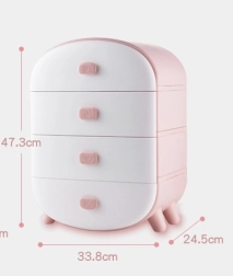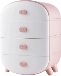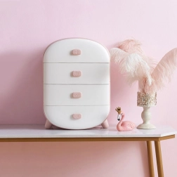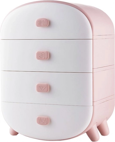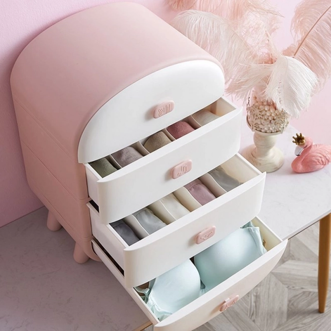 Muchiile rotunjite, designul modern și culoarea delicată roz-alb se integrează perfect în interior. Comoda este ușoară, stabilă și ușor de întreținut – este suficient să o ștergi cu o cârpă umedă. Poate servi și ca noptieră originală sau ajutor pe măsuța de toaletă.