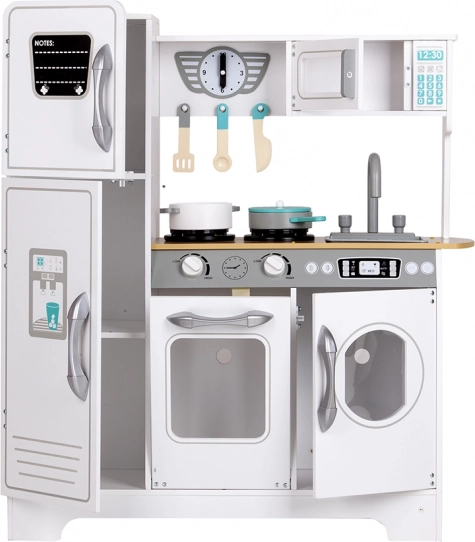 Descoperiți bucătăria robustă albă ECOTOYS, care transformă orice cameră de copil într-un mic studio culinar. Datorită elementelor realiste – de la butoane rotative cu sunet, la uși care se deschid și până la spații de depozitare funcționale – copiii trăiesc o joacă autentică de gătit, copt și spălat vasele.