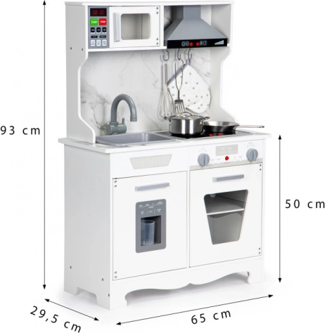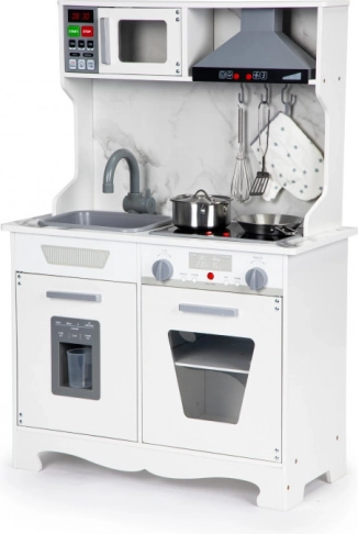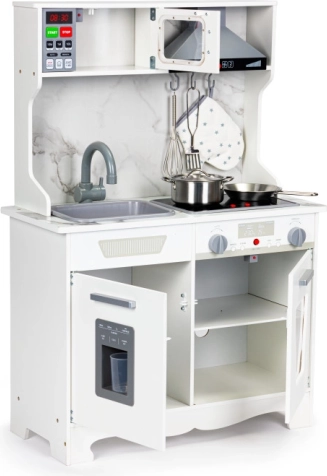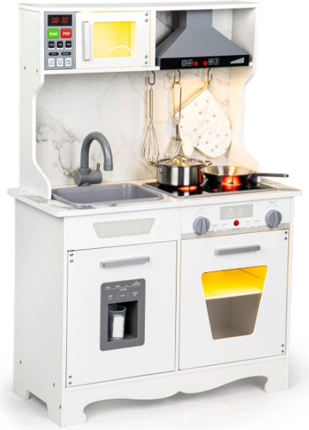 Faceți-vă copiii fericiți cu această bucătărie din lemn, care imită o bucătărie adevărată și este destinată copiilor de la 3 ani. Include efecte luminoase și sonore, care includ iluminarea arzătoarelor și cuptorului cu sunete realiste. Copiii pot să se joace și să-și dezvolte imaginația și abilitățile manuale, fără a pierde distracția.