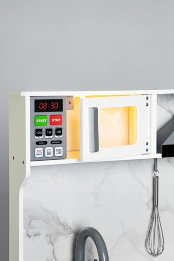 Include un cuptor cu microunde cu iluminare și efecte sonore și o hotă care imită un ventilator de bucătărie real.