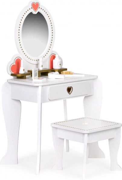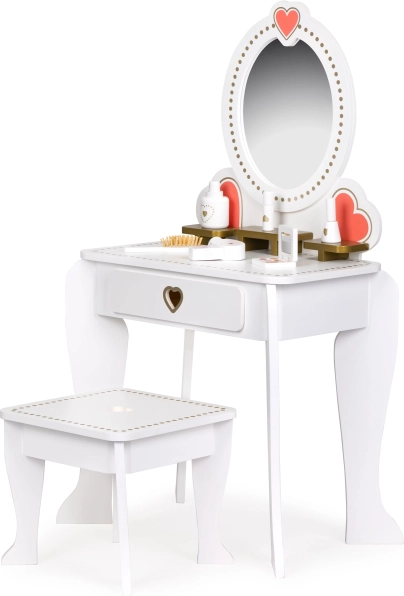 Masa de toaletă cu oglindă mare și ramă decorativă cu motive cu inimioare este perfectă pentru rolul de mică prințesă sau stilist. Construcția este sigură și oferă suficient spațiu pentru jocuri creative.