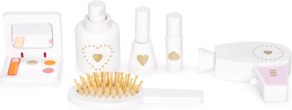 Masa de toaletă include accesorii de jucărie precum uscător de păr de jucărie, perie din lemn și oglindă mică. Toate accesoriile au margini netede, asigurând siguranța pentru copii.