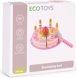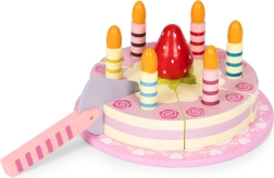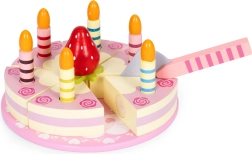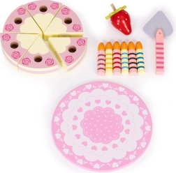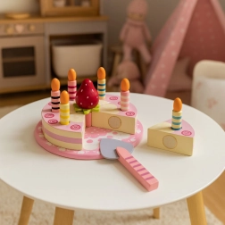 Conținutul setului: tort rotund împărțit în felii, 6 lumânări dungate, căpșună din lemn, paletă de servire și farfurie decorativă. Totul este realizat din lemn și vopsit cu culori sigure pentru copii. Setul stimulează jocurile de rol, antrenează coordonarea mână–ochi și îi învață pe copii să împartă și să servească oaspeții.