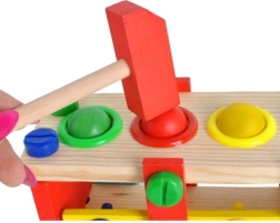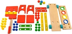 Jucăria include diverse părți pentru asamblare și dezasamblare independentă, inclusiv bile din lemn, șurubelniță și ciocănel.