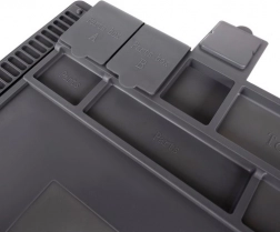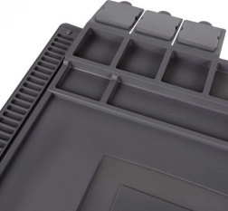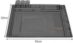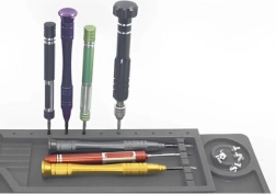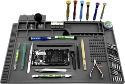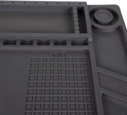 Acest covoraș de service din silicon multifuncțional este ideal pentru reparații de telefoane, laptopuri și lipire fină. Datorită celor 4 buzunare magnetice, compartimentelor organizate și zonelor dedicate pentru șurubelnițe, veți avea mereu sub control toate piesele mici și uneltele. Materialul antiderapant menține totul la locul său chiar și în timpul operațiunilor mai solicitante.