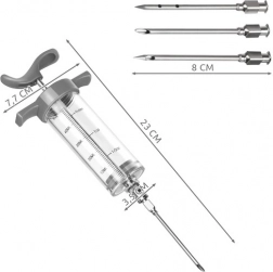 Această seringă de bucătărie este ideală pentru afumare, coacere și grătar acasă. Permite injectarea saramurii, a supelor și a marinadelor direct în fibrele cărnii, ceea ce scurtează considerabil timpul de marinare și asigură sărare și asezonare uniforme. Corpul transparent cu graduații în ml facilitează dozarea precisă.