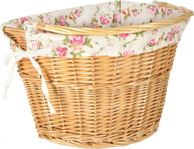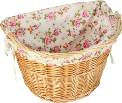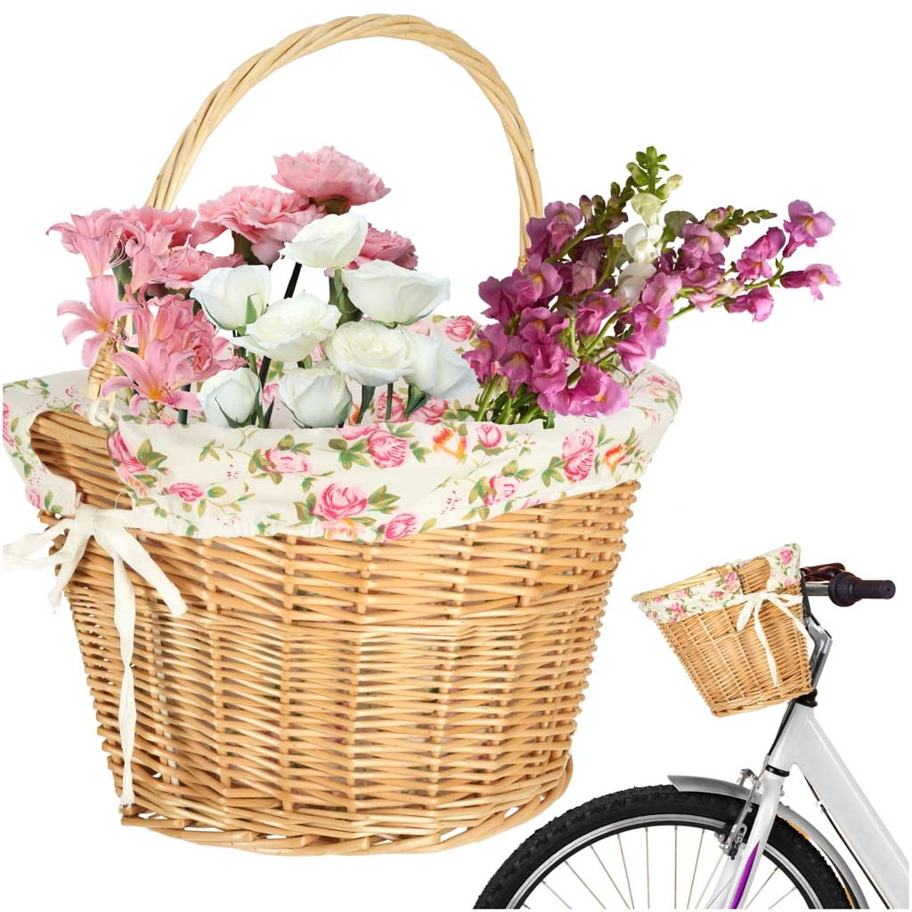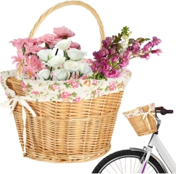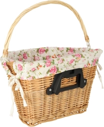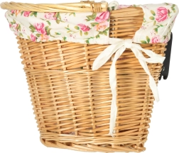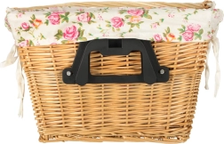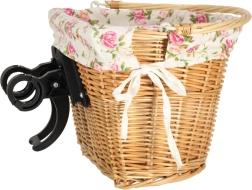 Coș din nuiele elegant pentru ghidon, cu inserție textilă cu model floral, ideal pentru deplasările zilnice prin oraș și plimbările de weekend. Oferă sistem de prindere rapidă click pentru detașare ușoară, construcție din nuiele robustă și mâner practic pentru transport confortabil. Inserția cu model floral adaugă farmec bicicletei și protejează conținutul.