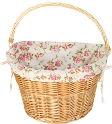 Coșul din nuiele elegant transformă fiecare plimbare într-o experiență plăcută. Datorită interiorului încăpător, poți transporta cu ușurință o poșetă, un rucsac mic și mici cumpărături. Inserția textilă cu motiv floral nu doar decorează, ci îți protejează și obiectele de zgârieturi și murdărie.