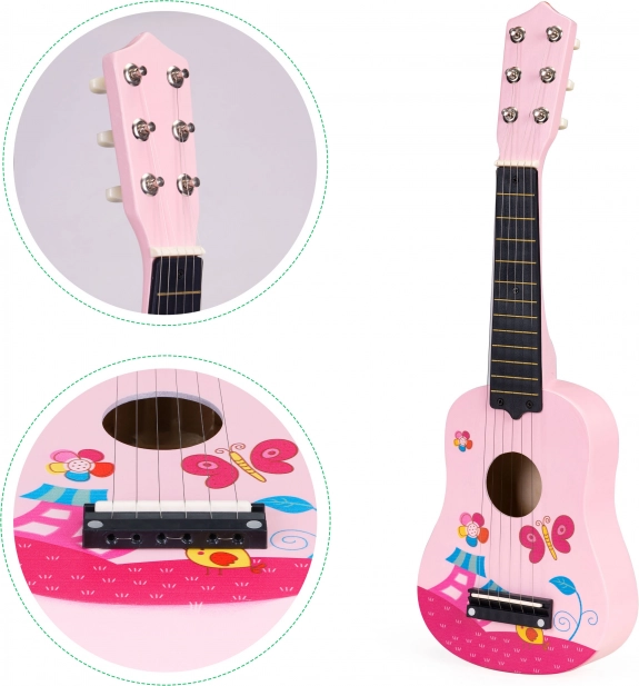 Chitară pentru copii din lemn marca ECOTOYS este destinată copiilor de peste 3 ani. Datorită corzilor acordabile, copiii pot învăța să cânte cântece simple sau mai complexe, iar întreaga familie poate performa împreună acasă. Cântatul la chitară ajută la dezvoltarea imaginației, motricității fine și a simțului ritmului.