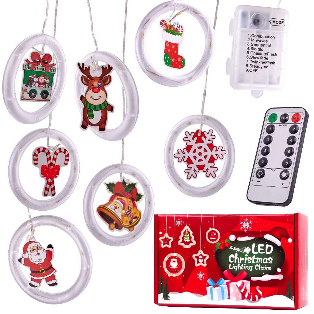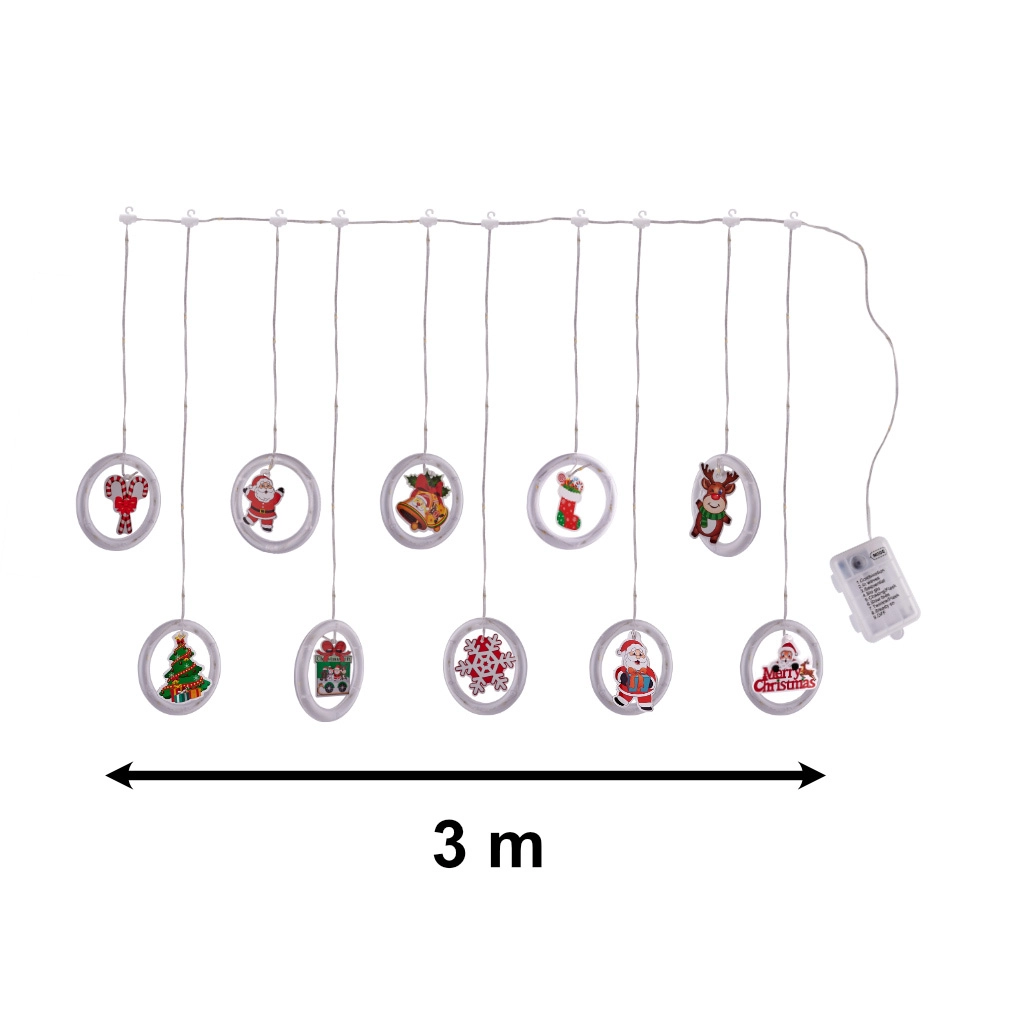 Zece pandantive circulare cu imagini de Crăciun (Moș Crăciun, ren etc.) adaugă un aer jucăuș și subliniază stilul festiv.