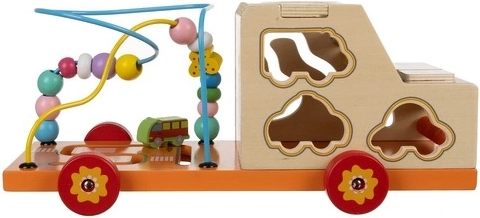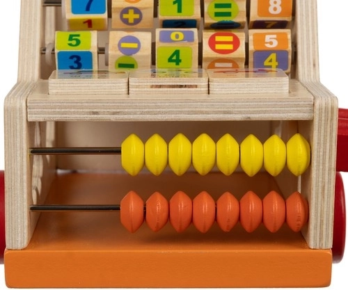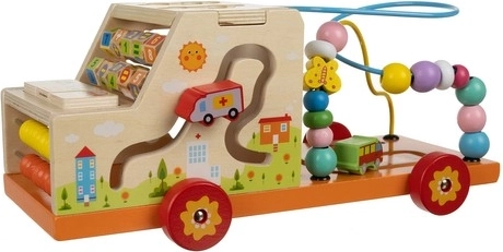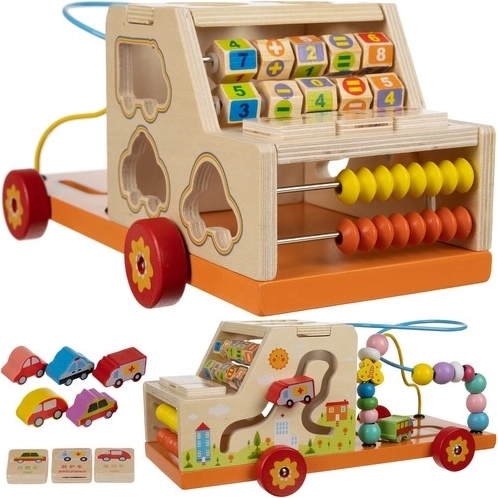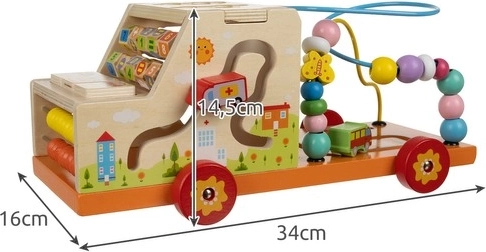 Dulap-mașinuță din lemn 6 în 1 Kruzzel combină distracția și învățarea într-un singur produs. Copiii pot descoperi forme diferite, pot învăța să numere cu ajutorul unui mic abac și se pot juca cu bile colorate pe traseele tip labirint.