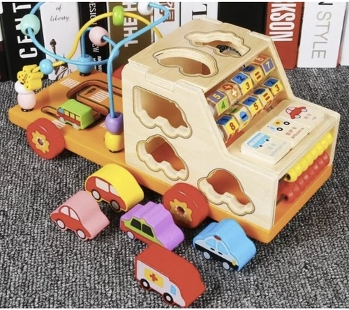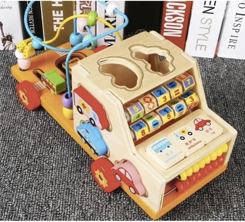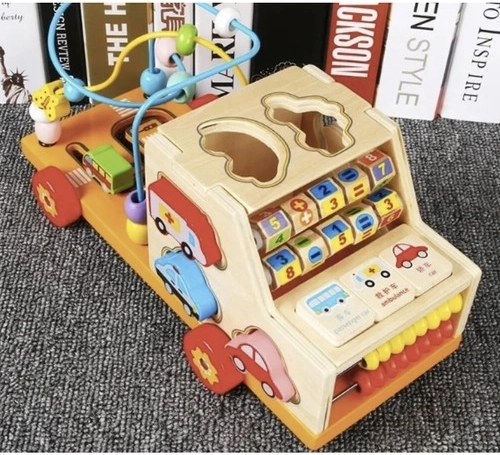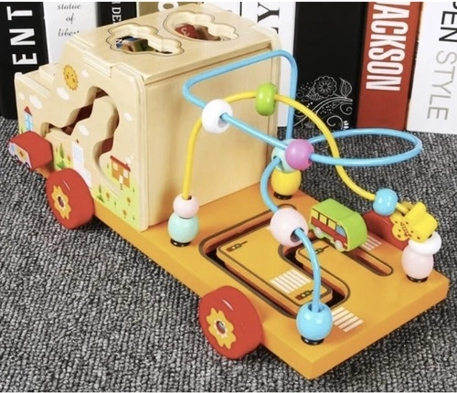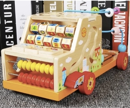 Această jucărie oferă șapte elemente educative, inclusiv o mașinuță pentru joacă, un mic abac, două trasee tip labirint, puzzle și sortator de forme.