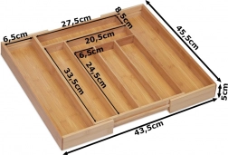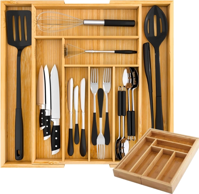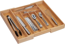 Menține ordinea în bucătăria ta cu acest organizator de tacâmuri din bambus, care oferă 8 compartimente spațioase. În fiecare compartiment, vei putea așeza ușor diferite tipuri de tacâmuri și alte ustensile de bucătărie. Materialul din bambus nu doar arată fantastic, dar datorită durabilității sale, este și ușor de întreținut – pur și simplu trebuie să-l ștergi cu o cârpă umedă.