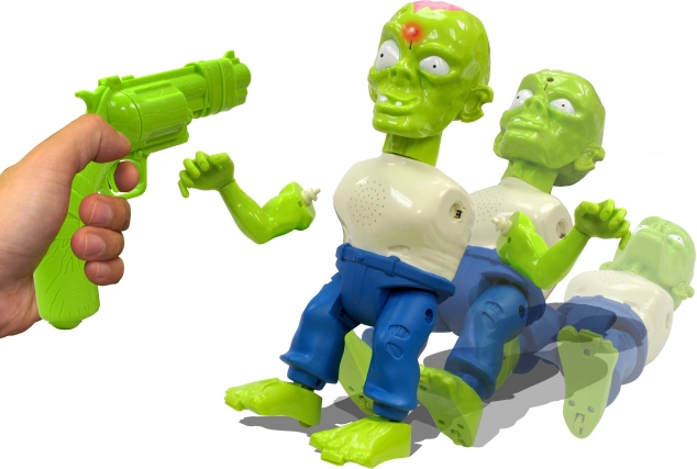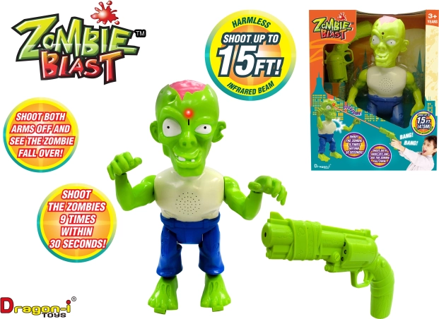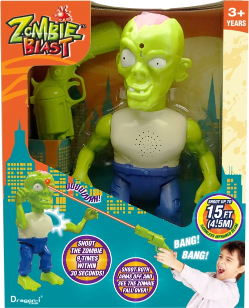 Tinerii șerifi își pot perfecționa stilat abilitățile de coordonare cu acest set profesionist de tras Zombie. Acest set ingenios folosește raze infraroșii în loc de gloanțe, astfel încât începătorii pot trage în ținte de la o distanță de până la 6 m. Pot doborî zombii, iar când își nimeresc ținta, vor auzi geamătul caracteristic al zombie-ului în timp ce părți din corp cad. Este o modalitate excelentă nu doar de a stimula imaginația și de a susține jocul, ci și de a îmbunătăți coordonarea mână-ochi, iar datorită urmăririi sigure cu infraroșu este potrivită și pentru utilizare în interior