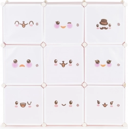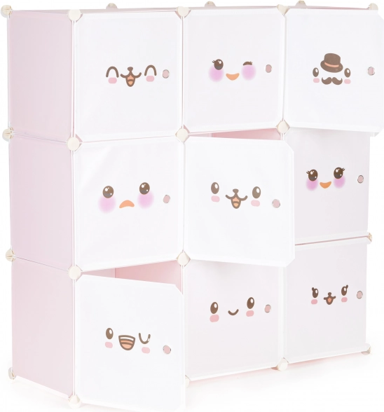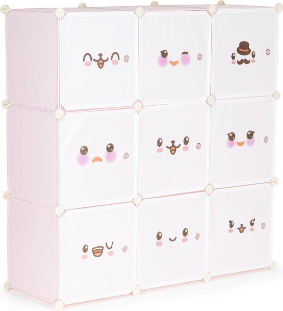 Acest dulap modular pentru copii oferă depozitare organizată și distractivă pentru jucării, cărți și mărunțișuri. Cele nouă cuburi cu uși cu motive vesele creează un mediu prietenos și îi motivează pe copii să mențină ordinea în mod independent. Datorită configurației flexibile, forma și organizarea dulapului pot fi adaptate ușor spațiului și nevoilor.